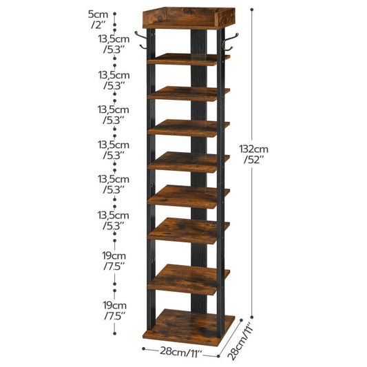 HOOBRO Narrow Shoe Rack, 9-Tier Tall Shoe Rack, Wooden Shoe Storage Organizer with 2 Hooks, Slim Shoe Shelf, Vertical Shoe Tower for Entrance, Industrial