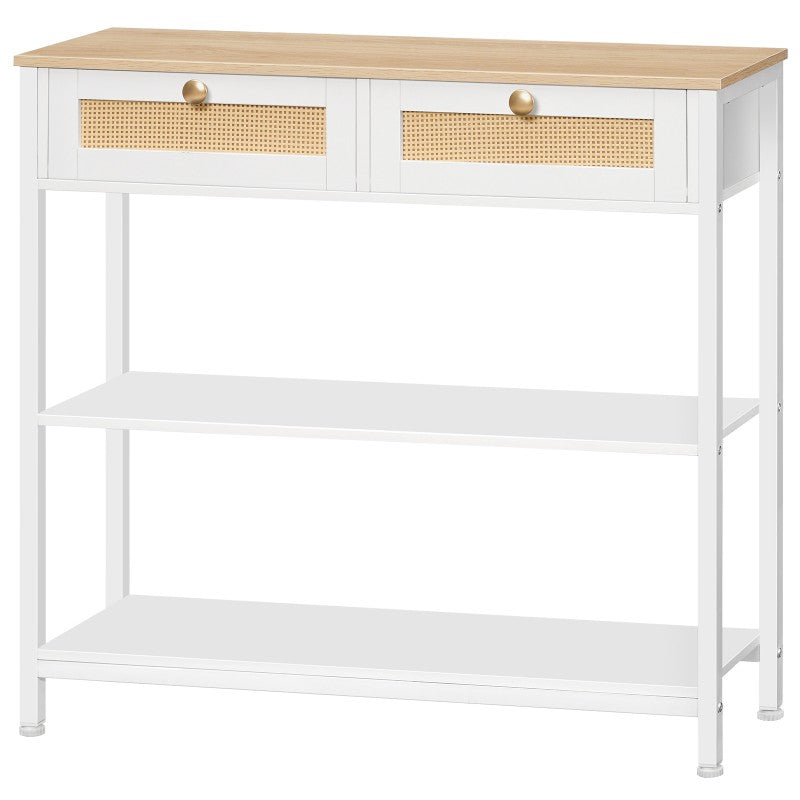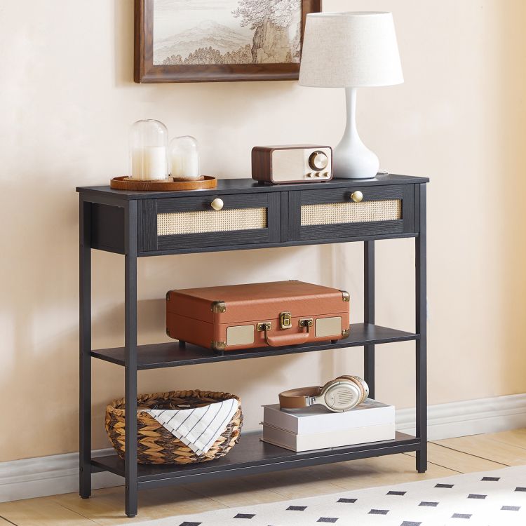 HOOBRO Rattan-Like Black Console Table, 3-Tier Hallway Table with 2 Flip-Down Drawers and Storage Shelves, 80 cm, Open and Hidden Storage Space, Woven Decoration