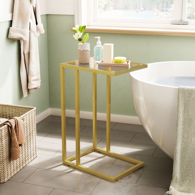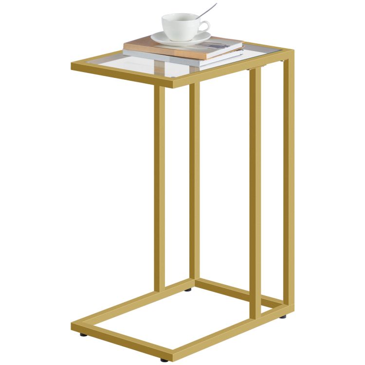 HOOBRO C Shaped End Table, Tempered Glass Gold Side Table, Under Sofa Table, Small Coffee Snack Table for Small Spaces, Laptop End Table for Living Room, Bedside Table, Metal Frame
