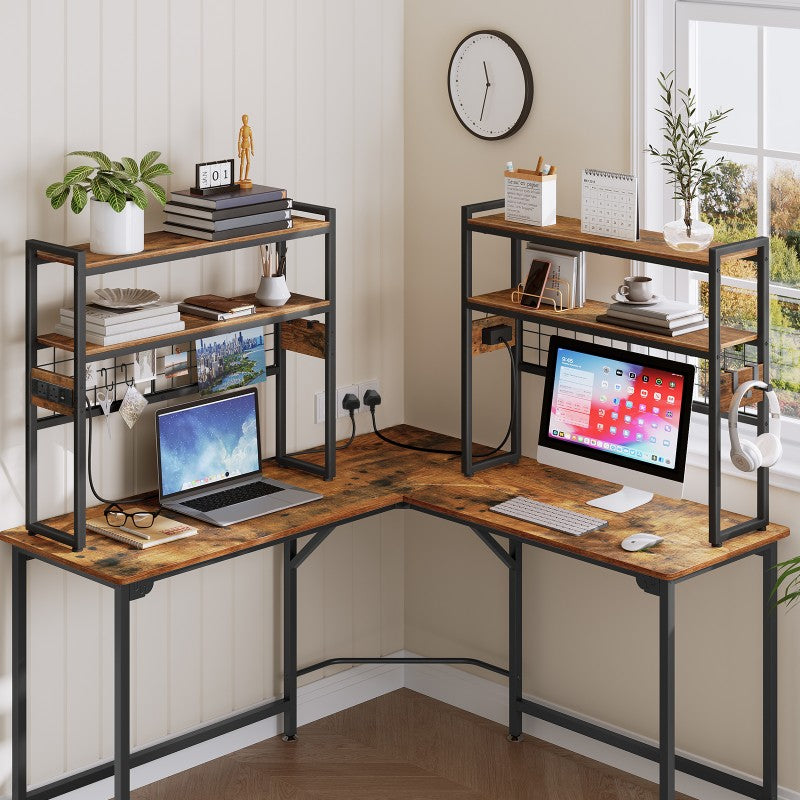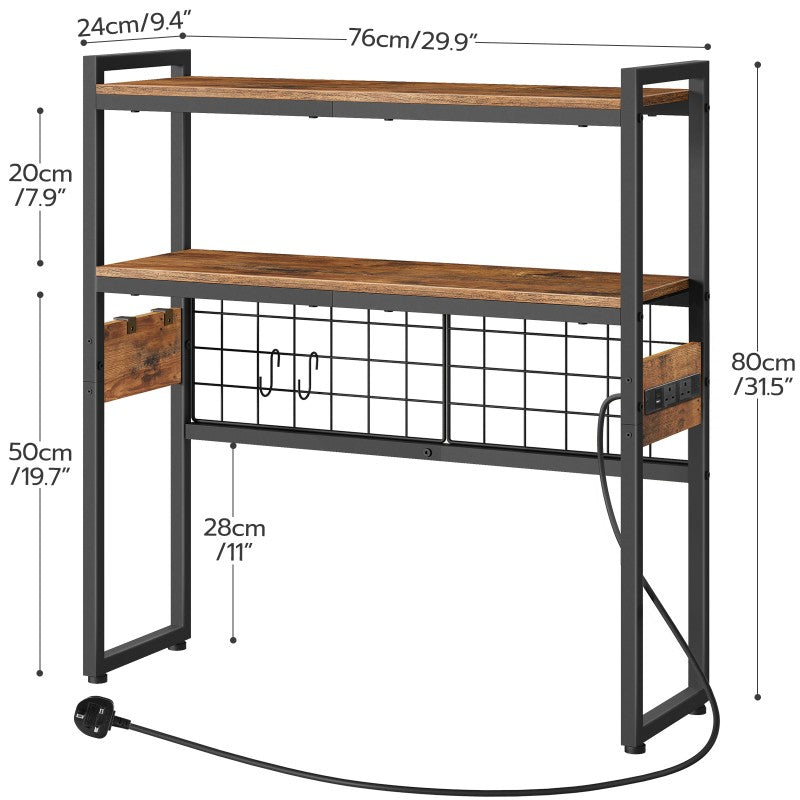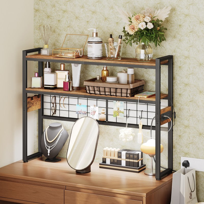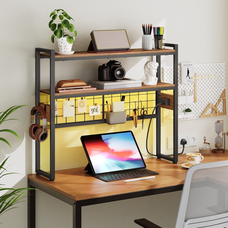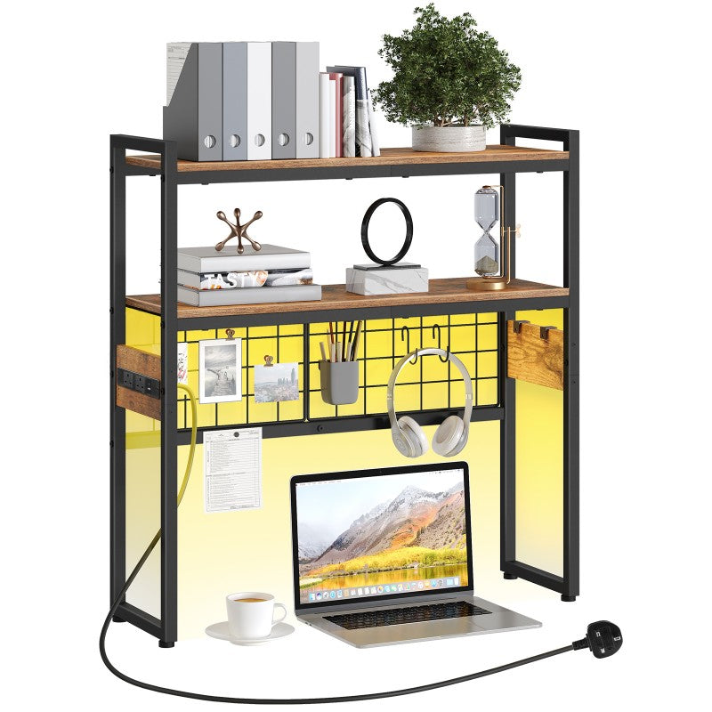 HOOBRO Desktop Bookcase with Outlets, 2-Tier Office Desktop Shelves, Countertop Hutch with LED Lights, Wooden Desk Shelf Organizer, for Office, Study, Game Room