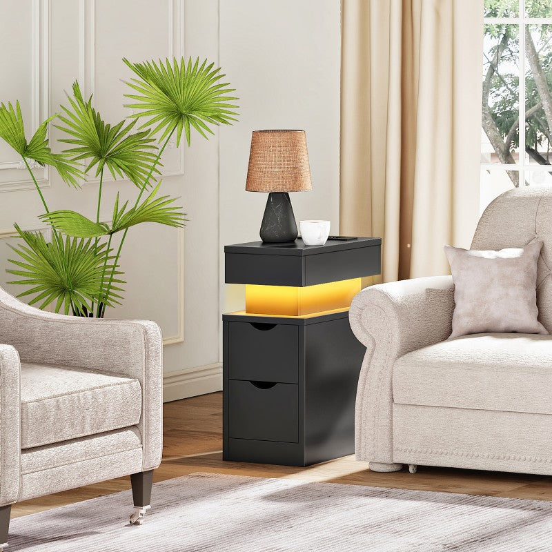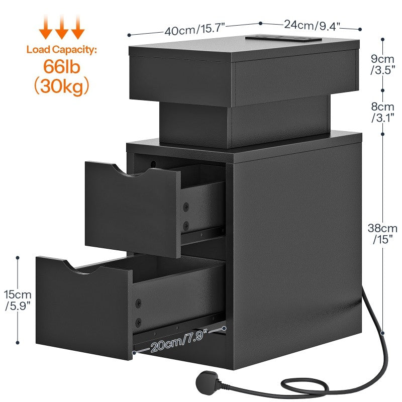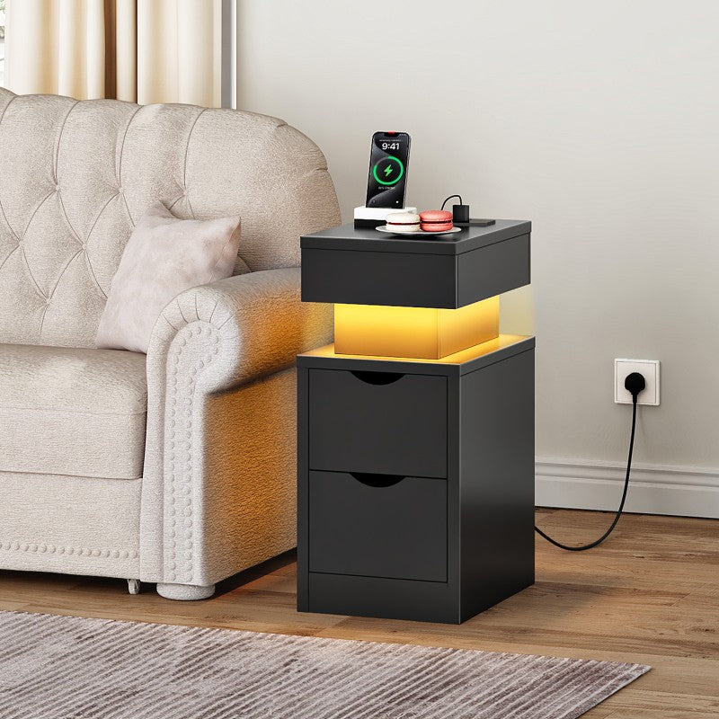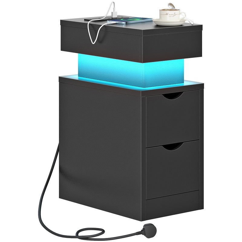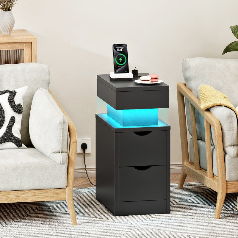 HOOBRO Bedside Table with Charging Station, Slim LED Nightstand with 2 Drawers, Narrow Side Table with Power, for Small Spaces, Bedroom, Living Room