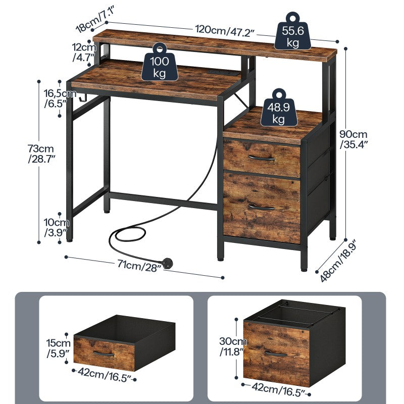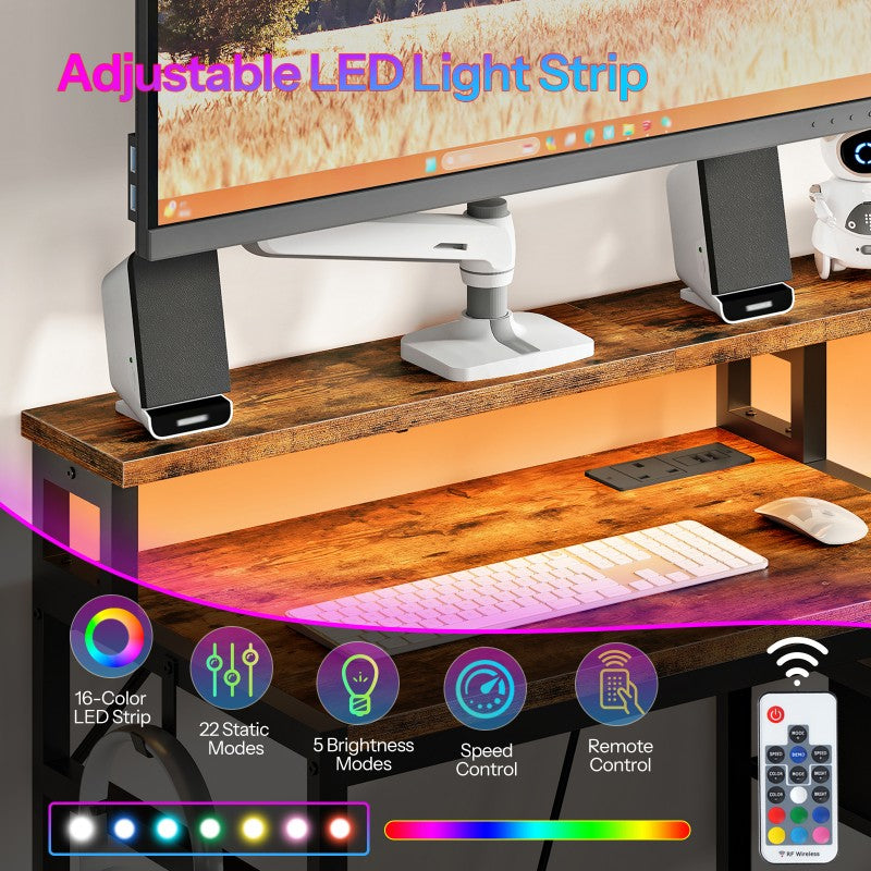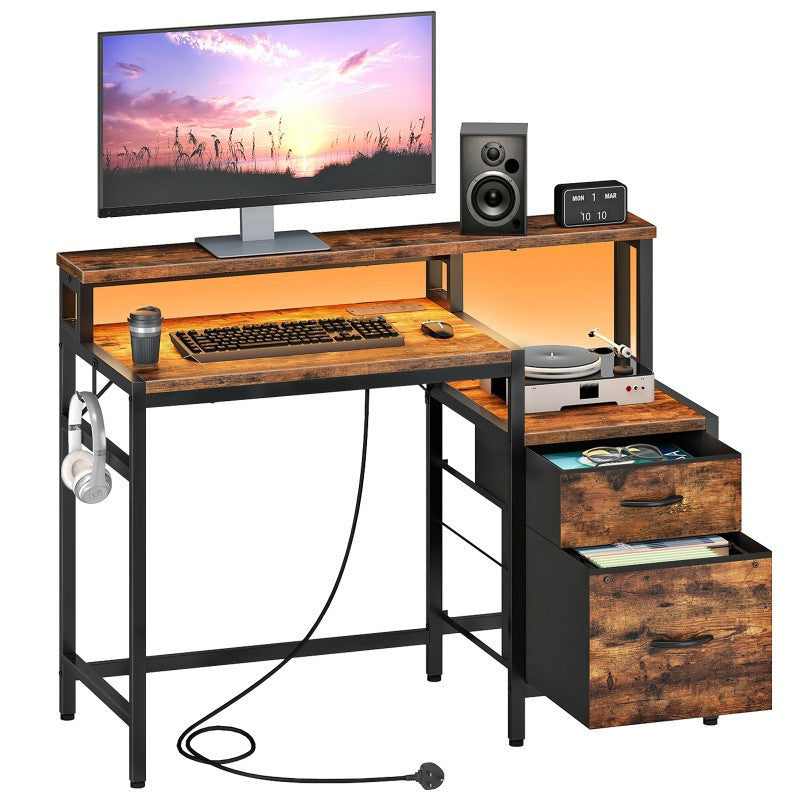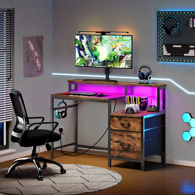 HOOBRO Computer Desk with Power Outlet, Gaming Desk with LED Lights, Monitor Stand, Office Desk with File Drawers, for Home Office, Study, Living Room