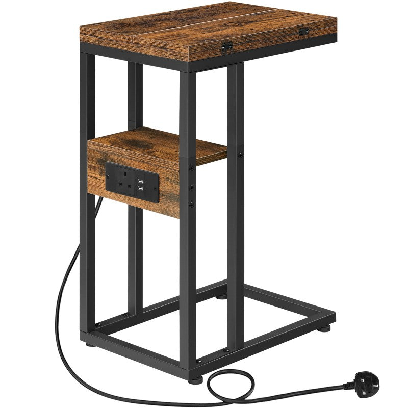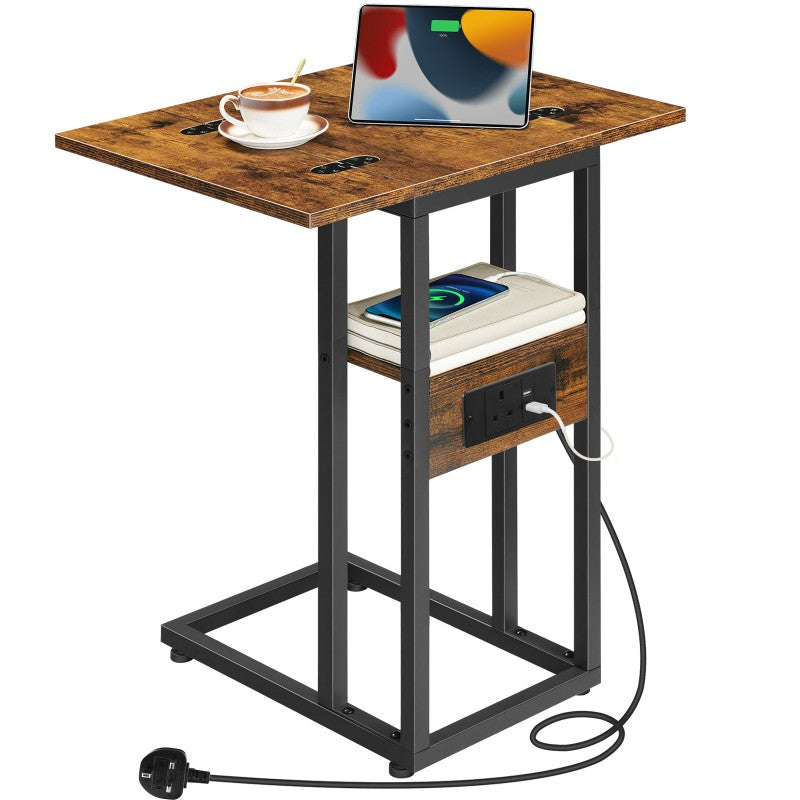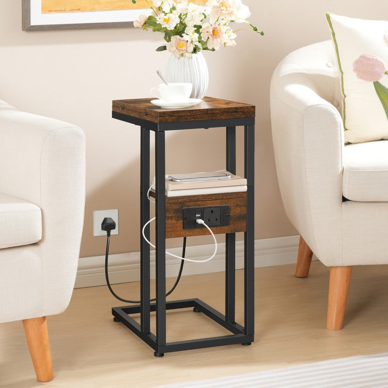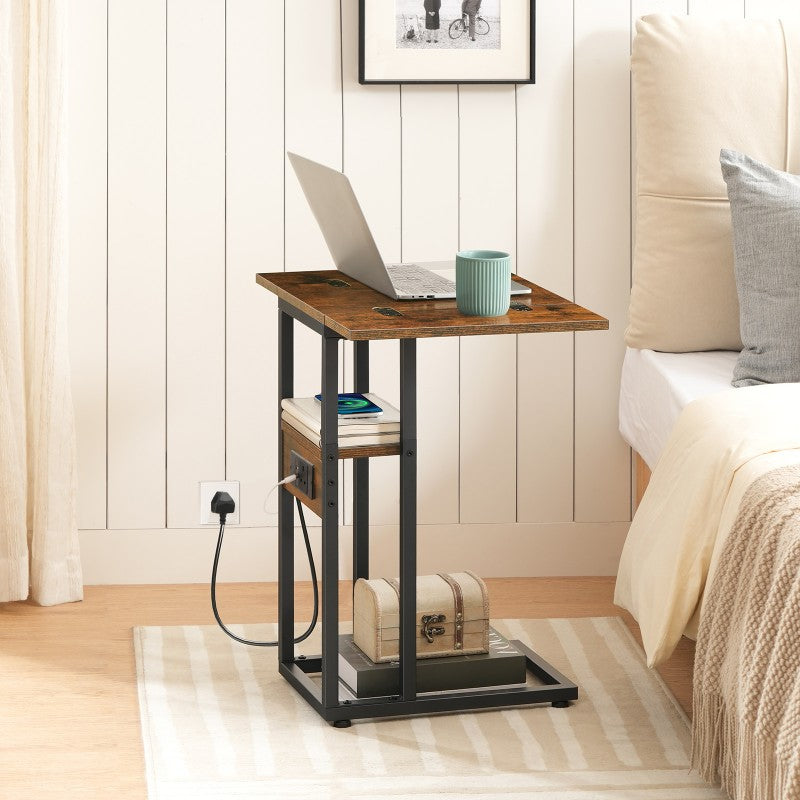 HOOBRO Foldable Side Table, Bedside Table with Charging Station, C Shaped Side Table, Slim Sofa Table Snack Tables with Storage Shelf, Small Table Laptop Table for Small Space