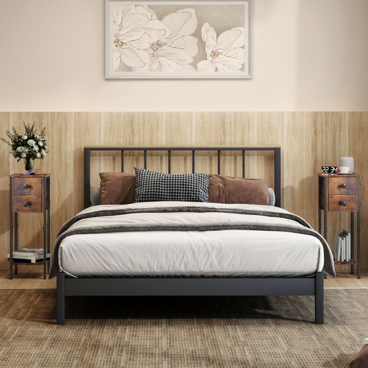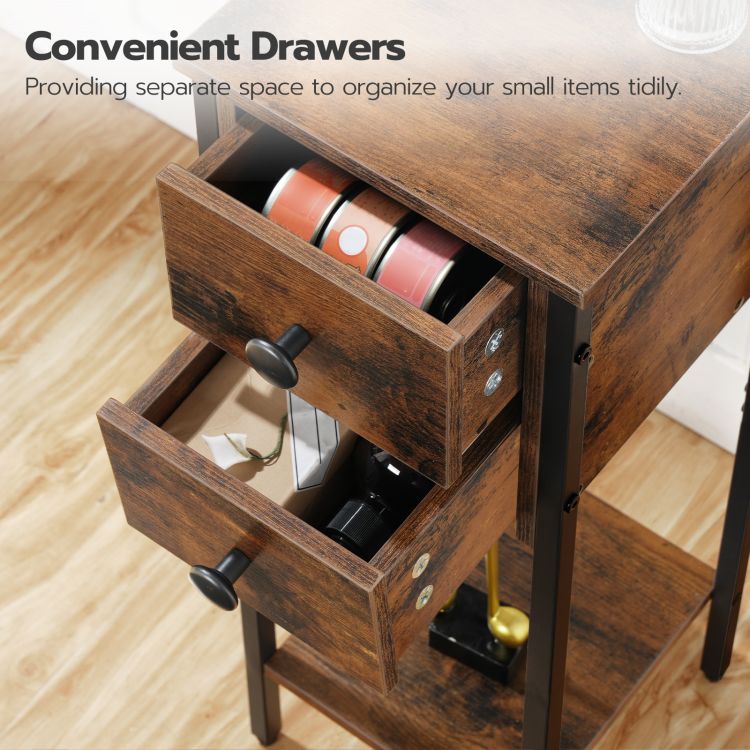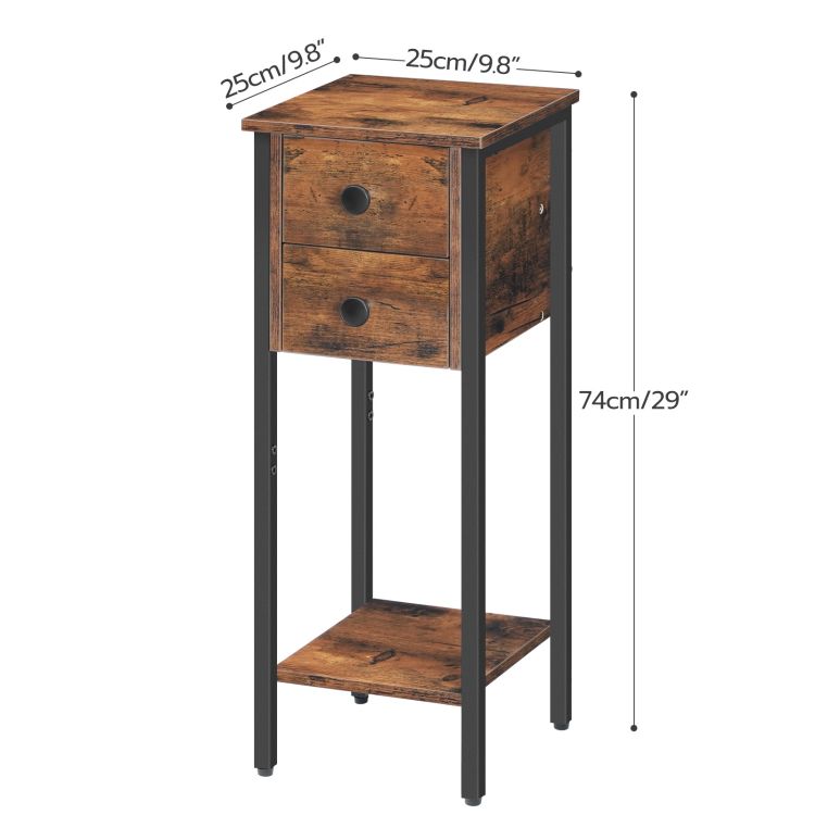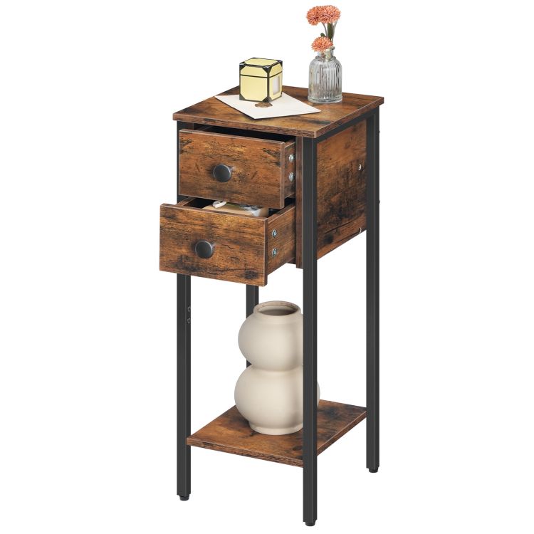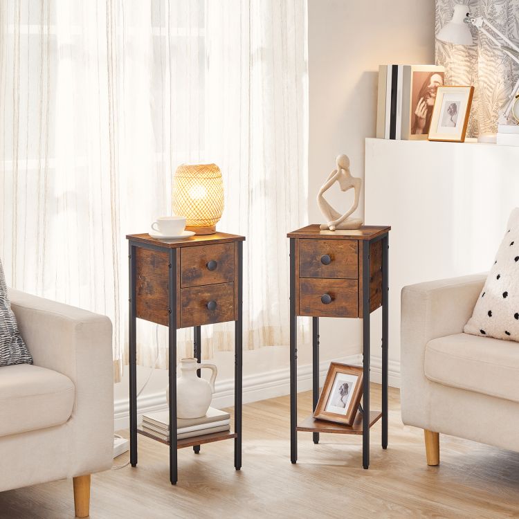 HOOBRO Narrow Bedside Table, Slim Bedside Table Set of 2, Telephone Table with 2 Drawers, Tall Side Table with Metal Frame, Small Nightstand with Open Shelf